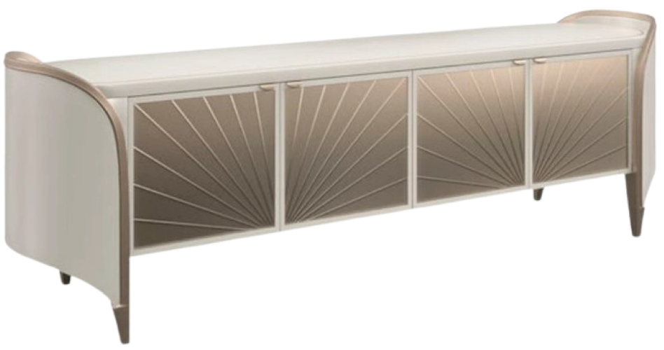 Mirror-like door fronts warmly reflect the room, while neatly concealing flexible storage with adjustable shelves and cutouts for cord management.