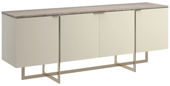 Stone, mirror-polished metal and hardwoods crisscross in this sleek media cabinet with linear appeal. Flowing Sandstone graces the 84” top of the Pearl-painted cabinet and four doors. The paint gives off just enough luster to make the piece intriguing. The doors have slim Whisper of Gold pulls.Read More