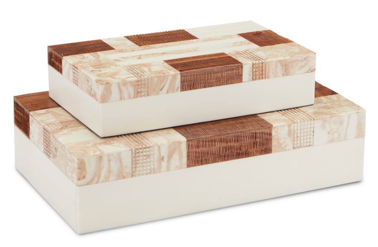 A surprising mix of materials makes up the 1940s Box Set designed by Aimee Kurzner. Covering the surface of the pair of tan and ivory decorative boxes are wood, composite, and linen. The wood tones add warmth, the composite brings coolness, and the linen adds texture to the overall composition. We also offer a 1940s Tray.Read More