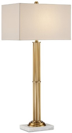 The white marble base and rectangular shade are pale elements that contrast the warmth of the metal, including the matching antique brass finial.