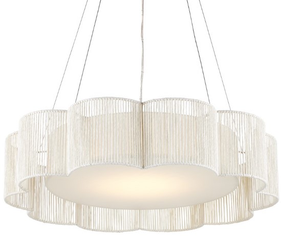 Scallops of Kraft paper twine fold around the wrought iron frame of the Ancroft Chandelier to form a delicate flowing silhouette. The string has a white finish that works in concert with the contemporary silver leaf on the metal to keep the white chandelier light and airy.Read More