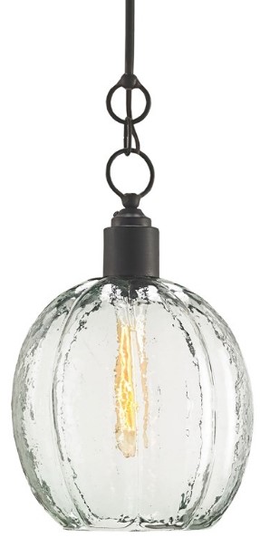 The Aquaterra Pendant with its recycled glass shade has a loveliness not often associated with recast glass. This is because the glassblower achieved a surface that reads like water frozen into a globe shape. An old-iron finish is a contrasting element on the glass pendant, which has an adjustable hanging height.Read More