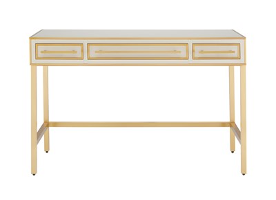 The Arden Ivory Vanity is inspired by a 1970s reverse-painted glass antique our director of furniture Aimee Kurzner found at the Paris flea market. The vanity features ivory reverse-painted glass panels on the top, front, and sides with solid brass trim, hardware, and legs. The ivory and gold vanity has a beveled top, and drawers with soft-close glides. A beautiful matching vanity mirror is sold separately, and the Arden family of furnishings includes several pieces in pink and in ivory.Read More