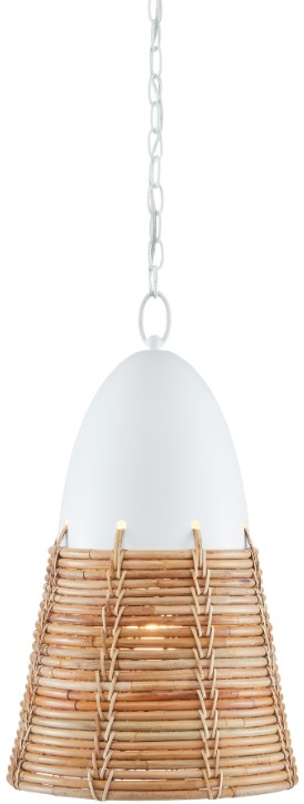. A design detail of note on this white pendant light is how the thinner strips of rattan that loop to hold the thicker strands in place disappear into the shade through drilled holes.