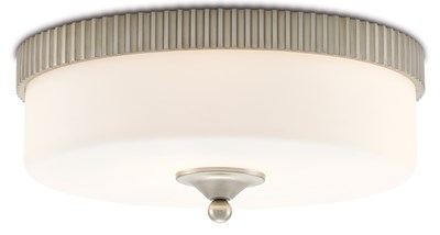 The Bryce Flush Mount is a modern fixture that is just as at home in any hall as it is in a bathroom. This simple round form is embellished with a motif that hearkens to industrial gears. Barry Goralnick has explored these forms with Currey & Company in other collections, the addition of the silver leaf surface a new elegant touch. The classically inspired finial capped off with a ball adds a sophisticated focal point. The glass diffuser in frosted glass provides an even glow. The Bryce is also available as a wall sconce.Read More