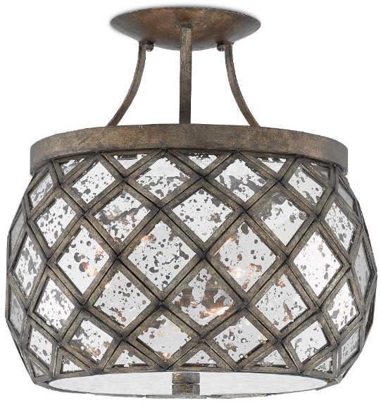 The Buckminster Semi-Flush Mount is composed of Raj mirrored squares, which are framed in wrought iron in a hand-finished Pyrite bronze. This mirrored chandelier was inspired by R. Buckminster Fuller's geodesic dome. We also offer the Buckminster in an orb chandelier.Read More