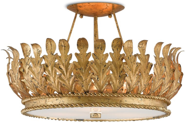 The acanthus leaves rising up from the rope-ringed band of the Biddulph Semi-Flush are made of wrought iron in a gold leaf finish. These match the mount securing this gold ceiling light to the white acrylic shade. This light is one of our introductions in the Bunny Williams Collection.Read More
