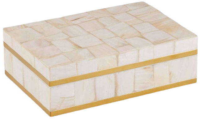 The Casey Mother-of-Pearl Box has a warm/cool interplay on its exterior, as the pale geometric shapes of the shell contrast the warmth of the polished brass trim that runs along the bottom and top of the sides.Read More