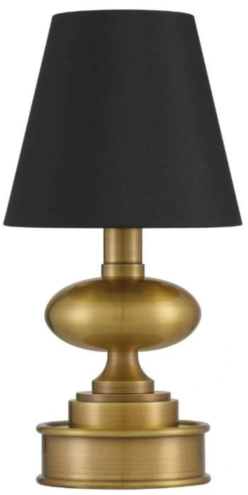 The Galavant Brass Cordless Table Lamp is a petite gold lamp that makes movement a breeze. The rechargeable bulb sits atop the metal body in a polished brass finish and the black shantung shade slides seamlessly over it.Read More