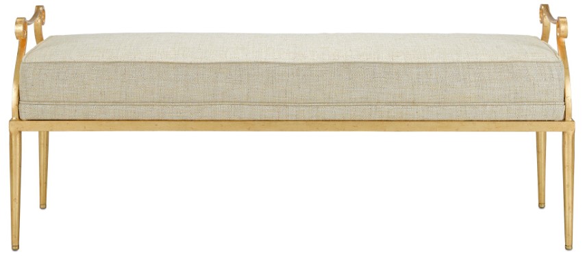 The frame of the Genevieve Shimmer Gold Bench is finished in rich Grecian gold that illuminates its legs and distinctive side flourishes reminiscent of Egyptian hieroglyphic symbology. The upholstered seat of the Genevieve is shown here in a F0175 Sequin Gold Dust fabric, which is made of 100-percent polyester.Read More