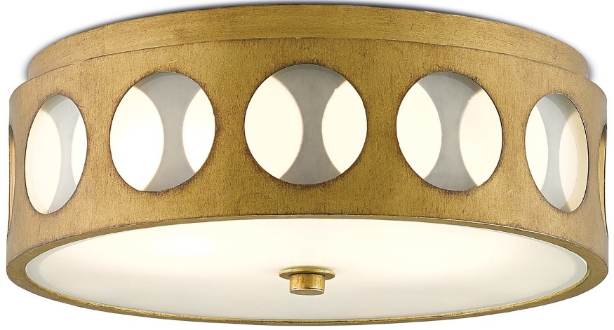 The Go-Go Flush Mount has a mid-century vibe with a shapely twist. The white opaque glass shade is slotted between two sheets of wrought iron in a brass finish. These are off-set to create half-moon shapes. The bottom diffuser on this gold flush-mount is made of opaque glass, as well. We also offer the Go-Go in a pendant.Read More