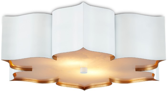 The Grand Lotus White Flush Mount receives its good looks from a combination of stunning workmanship and a mix of sugar white and contemporary gold leaf finishes. The white chandelier is skillfully fashioned from wrought iron.Read More