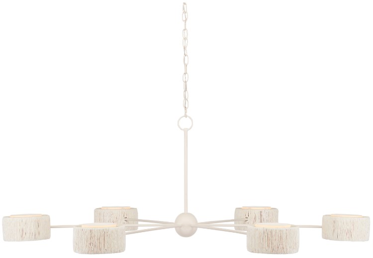 With shades made from recycled paper that has been twisted like braided hair, the Monreale Chandelier, designed by Clarence Mallari, has a frame made of round tubing that telescopes out from a central cog. The paper is painted white and the wrought iron frame has a vanilla finish that contributes to the lightness of this ivory chandelier.Read More
