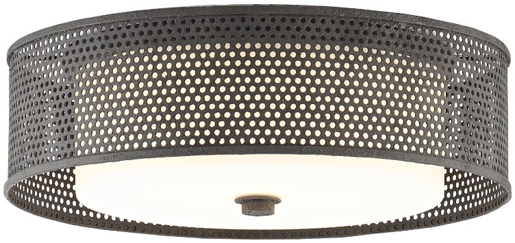 Our Notte Flush Mount is made of wrought iron in a Molé black finish. The shade, which has been punched, will create patterns on surrounding surfaces when the lights are on. The acrylic white diffuser on this black flush mount is held into place by a simple finial, also of wrought iron in a Molé black finish.Read More