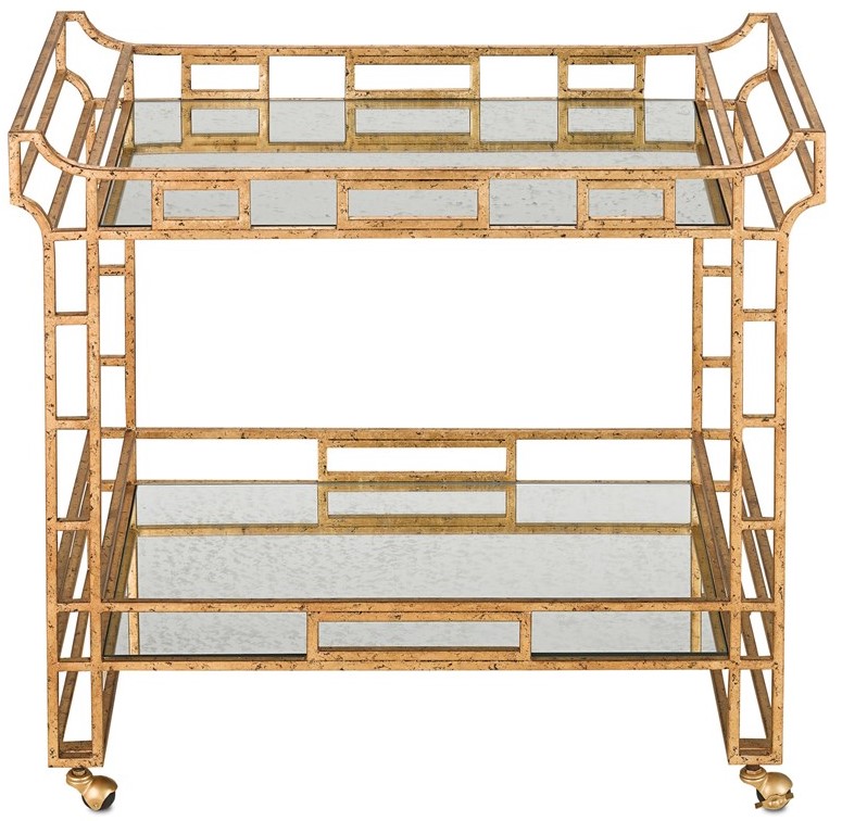 The Odeon Bar Cart has an Asian style with its skillful wrought iron fretwork in a Seneca gold leaf finish. The light Roche antique mirror surfaces and caster feet make this gold bar cart popular during happy hour and for the beauty it brings to a space.Read More