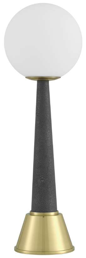 The Sortie Brass Cordless Table Lamp is a gold lamp that is always ready for action. The metal base in a brass finish holds the on/off switch. The telescoping body of the petite lamp is covered in a dark gray faux shagreen.Read More