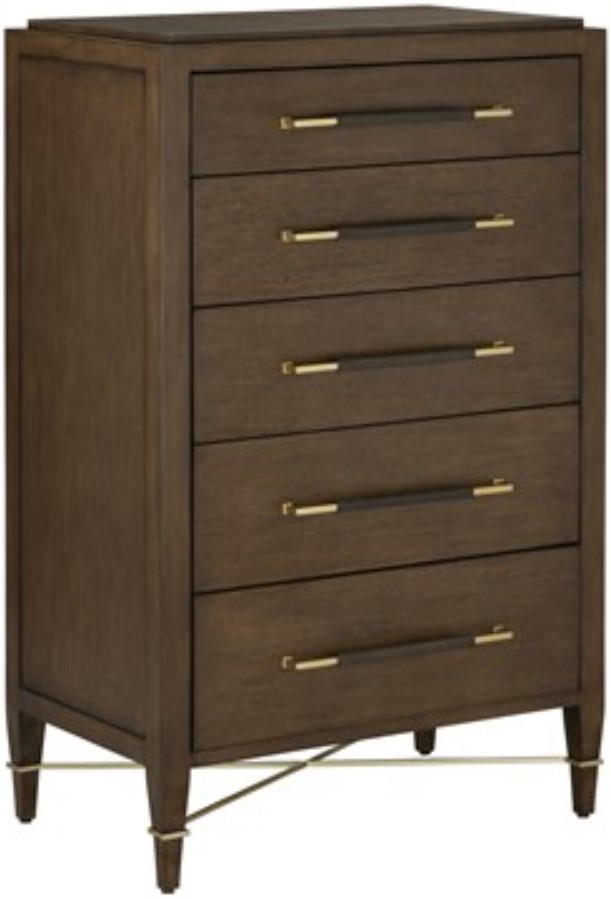 The Verona Chanterelle Five-Drawer Chest is warmly handsome covered in brown lacquered linen with metal detailing in a champagne finish. The stretchers on this brown chest create added interest to enhance its flair.Read More