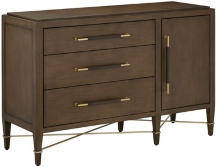 The Verona Chanterelle Three-Drawer Chest is warmly handsome covered in brown lacquered linen with metal detailing in a champagne finish. The stretchers on this brown chest create added interest to enhance its flair.Read More