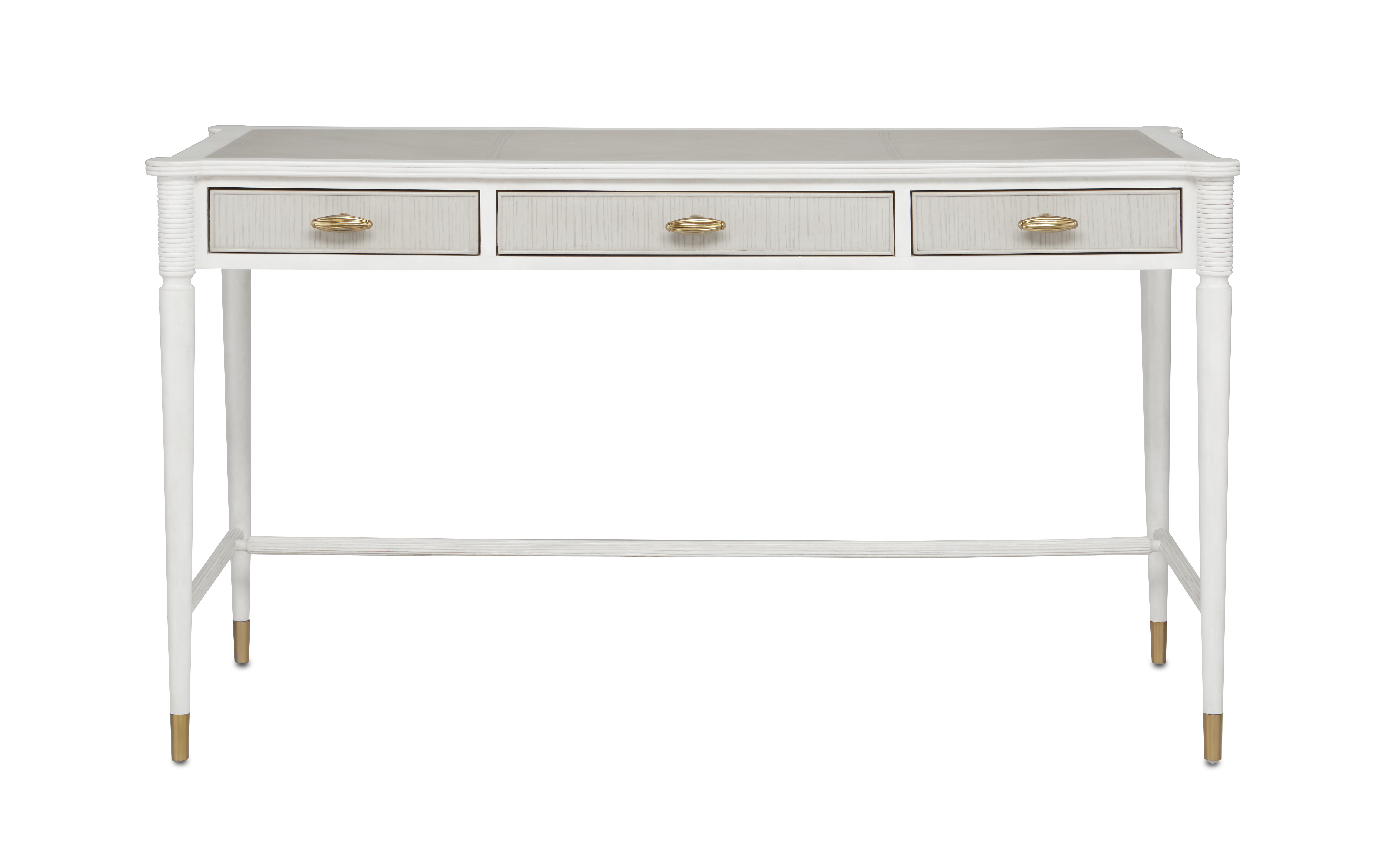 Made of mahogany and oak in a mix of Off White and Fog finishes, the Aster Desk was inspired by an antique from the Winterthur Museum. The gray and white desk has three drawers on which the brass pulls are warm accents in a brass finish. We also offer the Aster as a nightstand as part of our Winterthur Collection.Read More