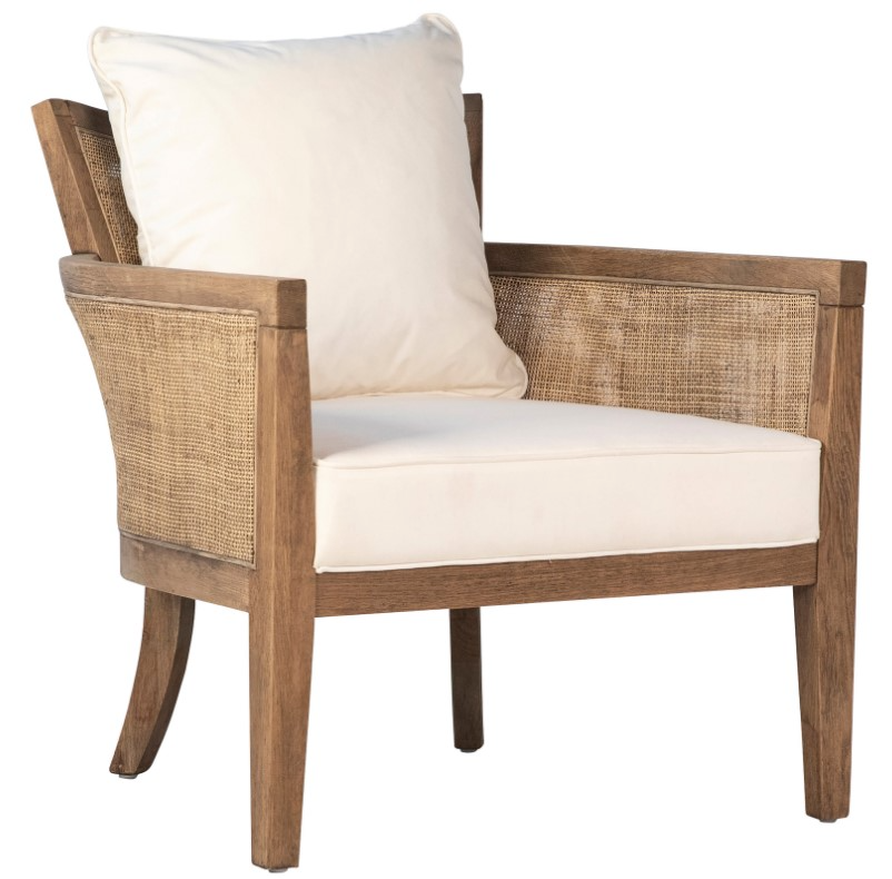 Made with mixed materials, this handsome tropical-inspired occasional chair features a natural white, cotton-blend cushioned seat and back rest supported by a natural oak wood frame wrapped in natural rattan panels.Read More