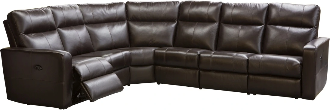 The Ellen 6-piece reclining sectional features contemporary styling, a track arm, and chaise seating. It is available in fabric, leather/vinyl combination or all leather.Read More