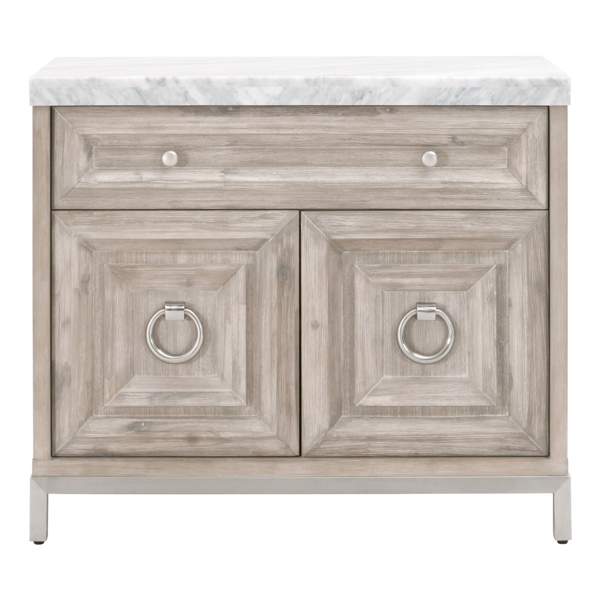 The Azure Carrera Media Chest shown in Natural Gray Acacia, White Carrera Marble, and Brushed Stainless SteelRead More