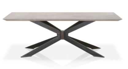 The District Industry rectangle dining table shown in ash gray concrete, distressed black iron features metal base design with solid wood accent and rectangle top with angled edge.Read More