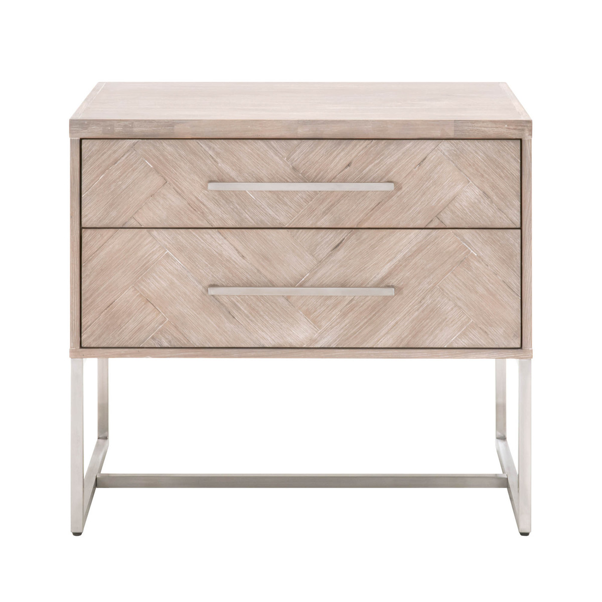 The Mosaic Nightstand shown in Natural Gray Acacia and Brushed Stainless Steel with stylish herringbone pattern.Read More