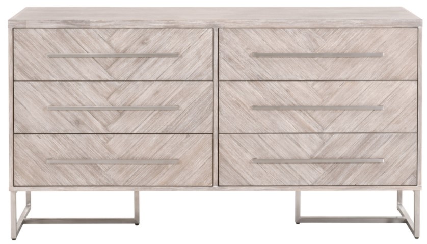 This Mosaic Double Dresser with an Natural Gray finish has six drawers with veneer parquet drawer fronts. Incorporate this dresser into your bedroom decor to give your home an eye-catching update.Read More