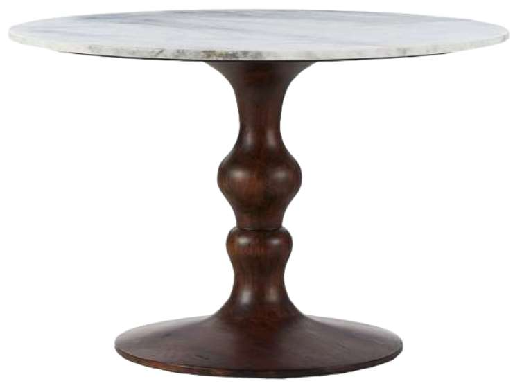 The traditional turned base dining table gets an updated look with a double curved tulip-shaped base and smooth marble tabletop. Base is crafted from solid acacia wood in a heavy wire-brushed finish that showcases the deep wood graining, adding character to the piece. Paired with white marble. Seats four.Read More