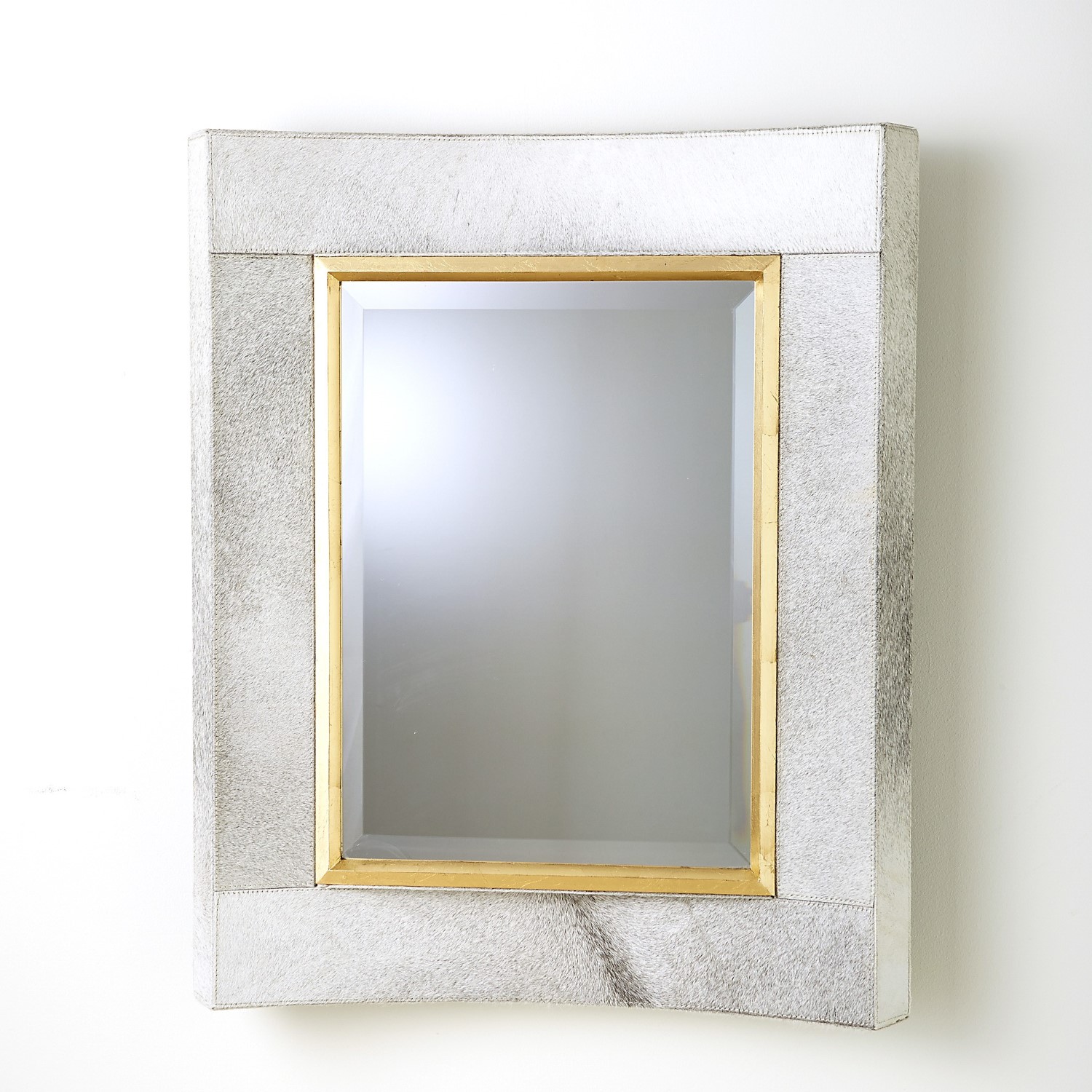 Done in lavish white hair on hide, our Curved Mirror is so simple, yet makes quite a statement. The soft curves of the dusky frame contrasts with the completely flat beveled mirror that is surrounded by a gold leaf wood fillet. The mirror hangs elegantly in a vertical position.Read More