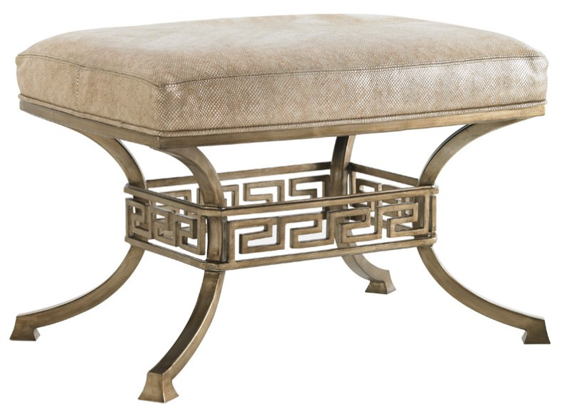 This ottoman presents an exquisite accent at the end of the bed, providing seating when getting ready, or a place for the decorative pillows or bedding not used during the sleeping hours. Although the gold leaf finished metal base is available only as shown, custom leathers may be applied to coordinate with your color scheme.Read More