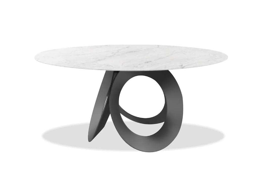 The unique circular base design is made from black powder-coated steel and features three circular structures that resemble a piece of art. The base provides sturdy support while also adding a visual interest to the table's overall aesthetic.