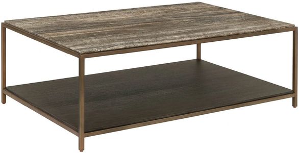The brindle cocktail table combines a striking dark gray travertine stone top with a rich cocoa wood shelf for material sophistication. The sleek smoked gold metal frame creates geometric interest while elevating the natural beauty of premium stone and wood materials.Read More