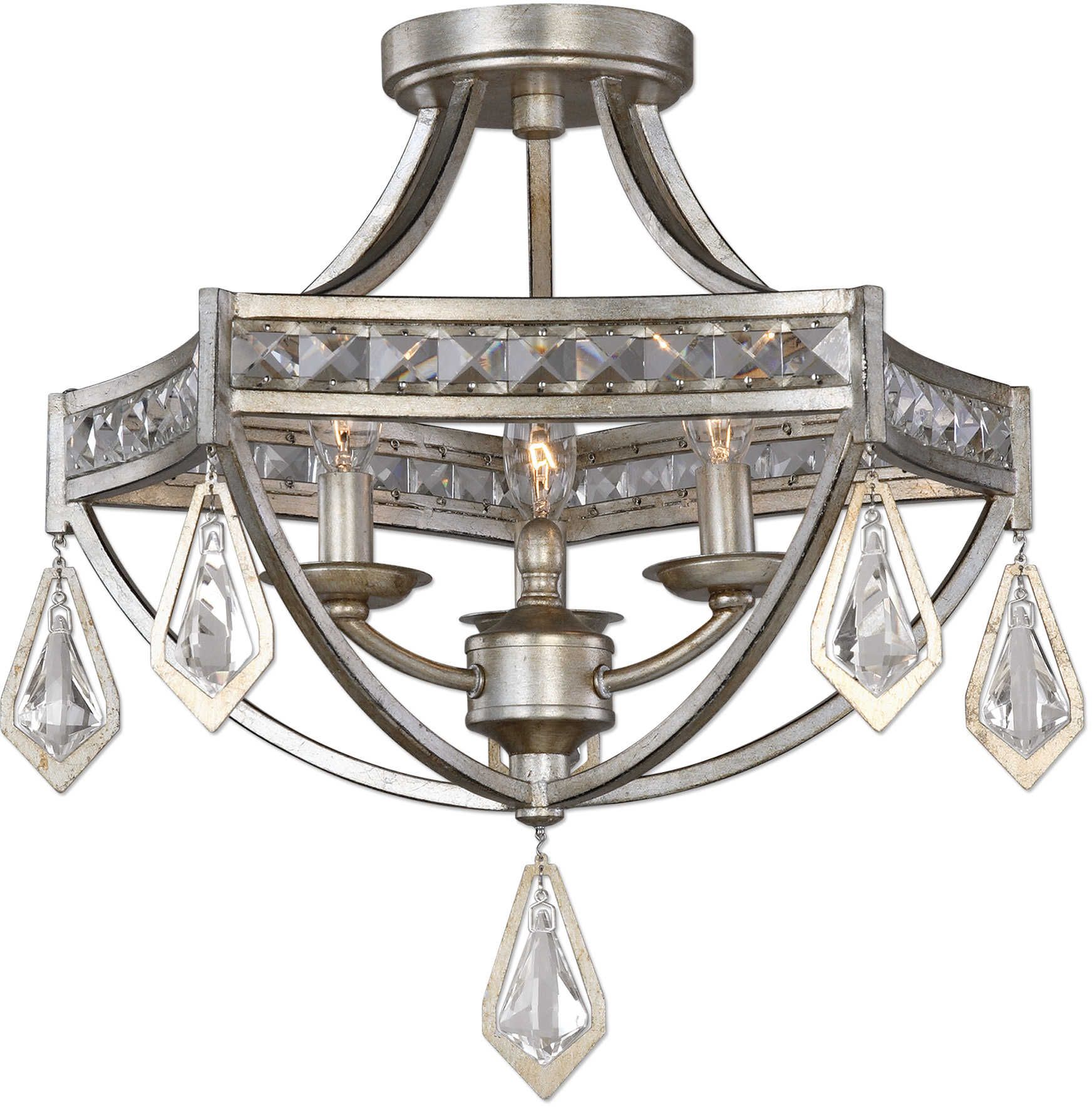 Burnished silver champagne leaf finish with modern clear crystal accents highlight this majestic semi flush fixture.Read More