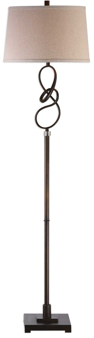 Hand twisted steel, finished in an oil rubbed bronze, accented with thick crystal details. The tapered round hardback shade is a light beige linen fabric with natural slubbing.Read More